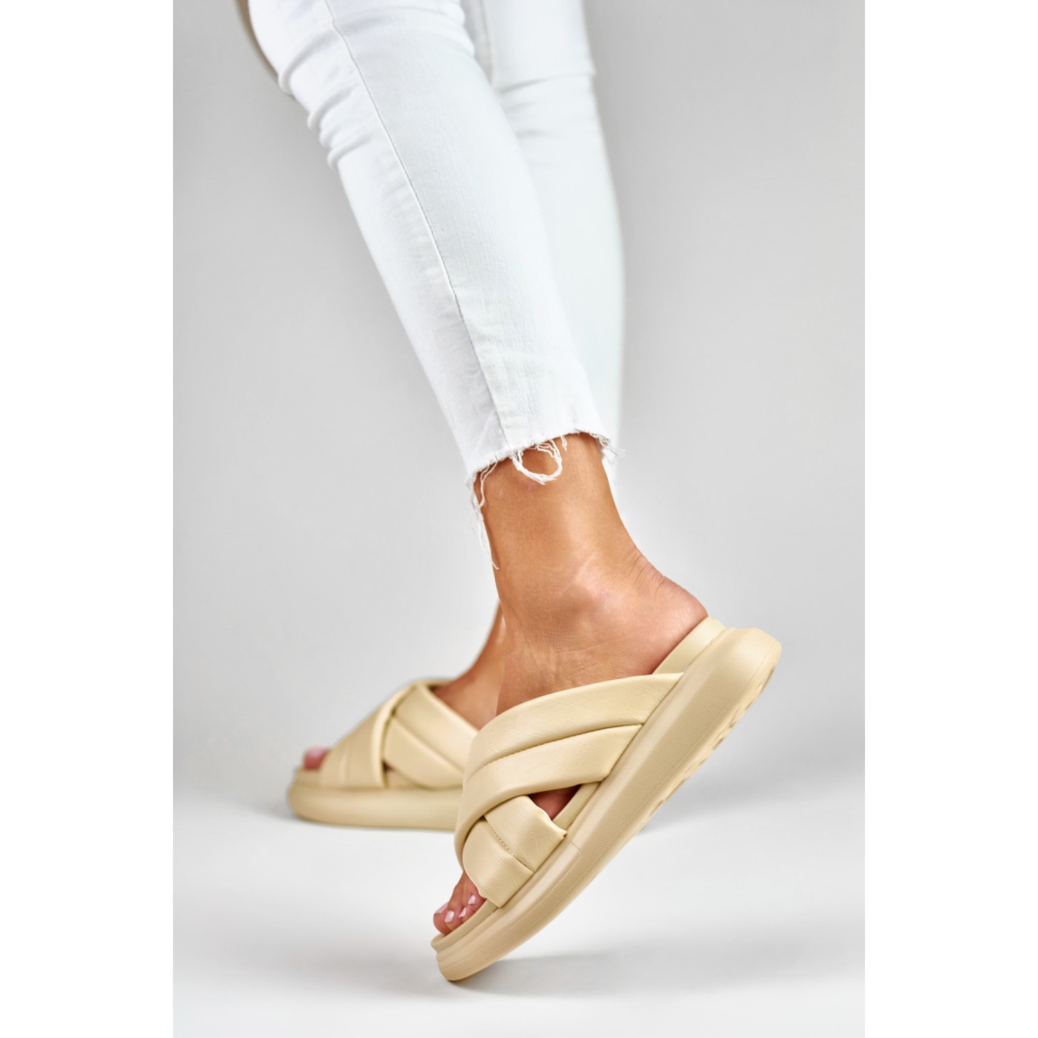 Flip -Flip -Flip -Flip -Flip -Flip într -o culoare bej atemporală sunt o alegere excelentă în fiecare zi. Fabricate din piele organică de înaltă calitate, oferă confort și îngrijire simplă, iar 3,5 cm platforma subtil subtil figura, fără a renunța la confort. Modelul alunecat cu nasul deschis este ideal pentru zile mai calde, potrivind multe stilizări de vară.