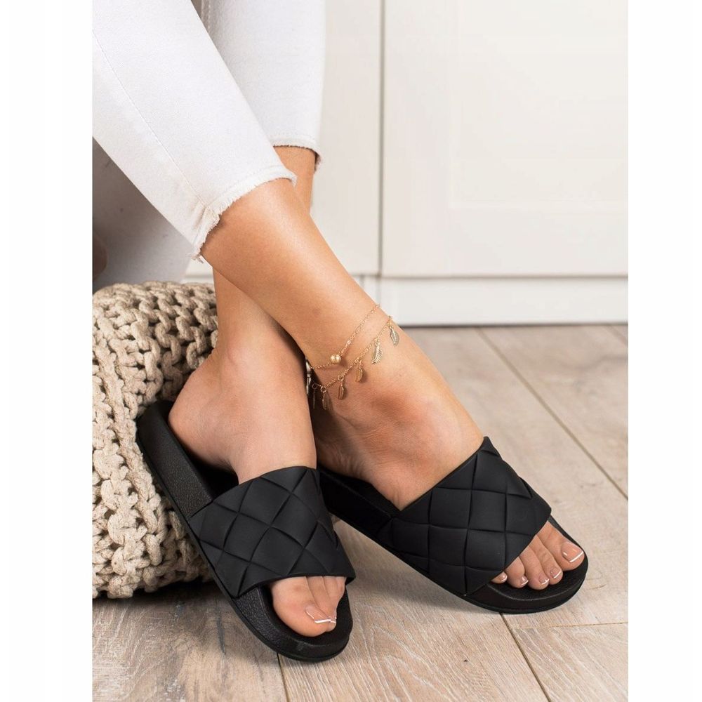 Fața neagră, matlasată a pantofilor le oferă un aspect minimalist și elegant, care va fi apreciat de femeile care prețuiesc stilul casual. O închidere convenabilă și un toc deschis fac șlapii ușor de pus și de scos, ceea ce este deosebit de important în zilele caniculare.