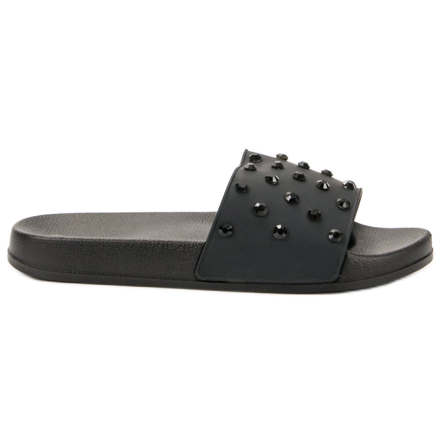 Sandalele negre sunt îmbogățite cu cristale elegante care le fac șic și atrăgătoare. Designul lor minimalist, fără modele suplimentare, le permite să fie asortate cu ușurință la diverse stiluri - atât casual, cât și sport. Vor fi perfecte în combinație cu rochii de vară, pantaloni scurți sau pantaloni de trening.