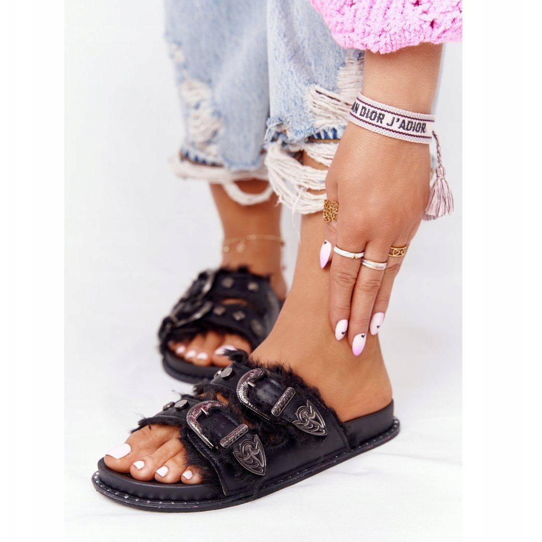 Vă prezentăm șlapi unici PS1 pentru femei în negru, care combină confortul cu designul la modă. Modelul Lydia se distinge printr-un branț profilat care îl face confortabil de purtat pe tot parcursul zilei. Partea superioară a șlapilor este decorată cu catarame argintii elegante și blană ecologică moale, ceea ce îi face complementul perfect pentru stilul de vară.