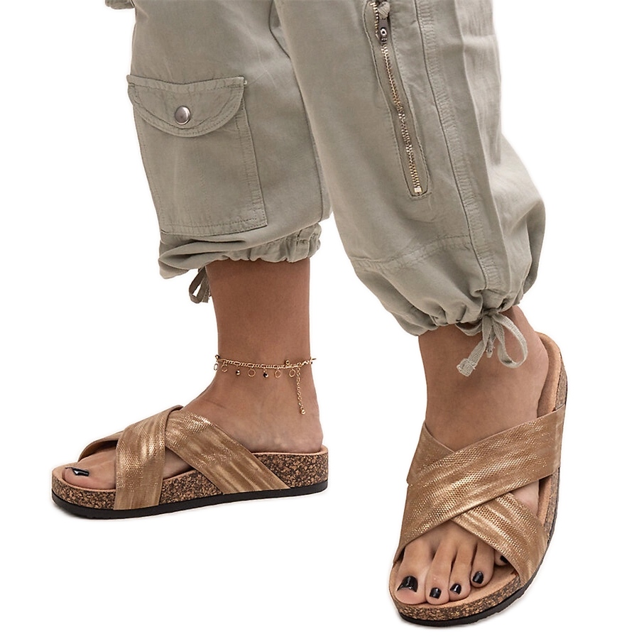 Nuanța lor metalică în culoarea cămilei și accentele de aur adaugă un moment de splendoare și fac ca clapele să se amestece bine cu diverse stilizări de vară. Datorită finisajului pielii ecologice din piele de căprioară, inserția asigură moale și confort pentru picioarele tale.