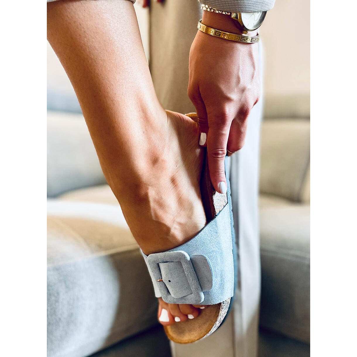 Șlapii Priya Blue cu talpă din plută sunt alegerea perfectă pentru femeile care apreciază confortul și stilul. Acești șlapi din piele intoartă într-o frumoasă culoare albastră se potrivesc perfect cu natura casual a stilului de zi cu zi. O centură largă cu cataramă reglabilă permite o potrivire perfectă pe picior, iar branțul interior profilat garantează confort chiar și în timpul utilizării pe termen lung.