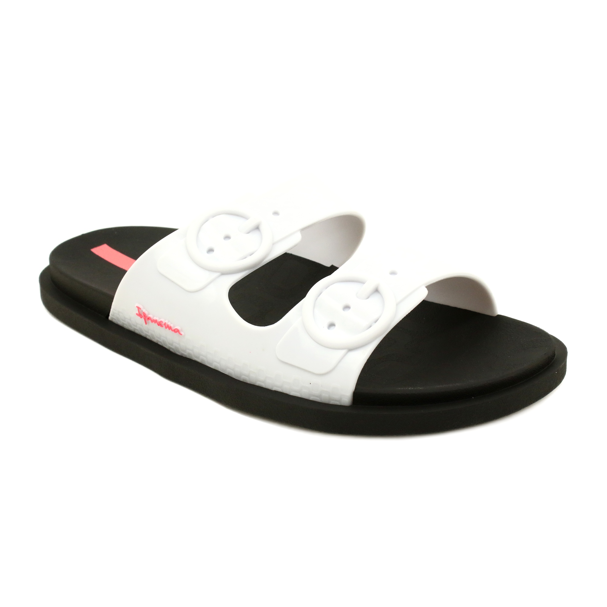 Papuci elegante, confortabile și practice Ipanema 26877 Urmați fem în culori alb -negru - dungi albe pe o talpă neagră. Datorită cauciucului moale, flexibil, acestea se adaptează bine la picior, fără a se deforma, iar două benzi de gel stabile stabil pentru a susține - nu alunecați în jos când mergeți, ceea ce este de o importanță deosebită pe suprafața umedă și alunecoasă a piscinei.
