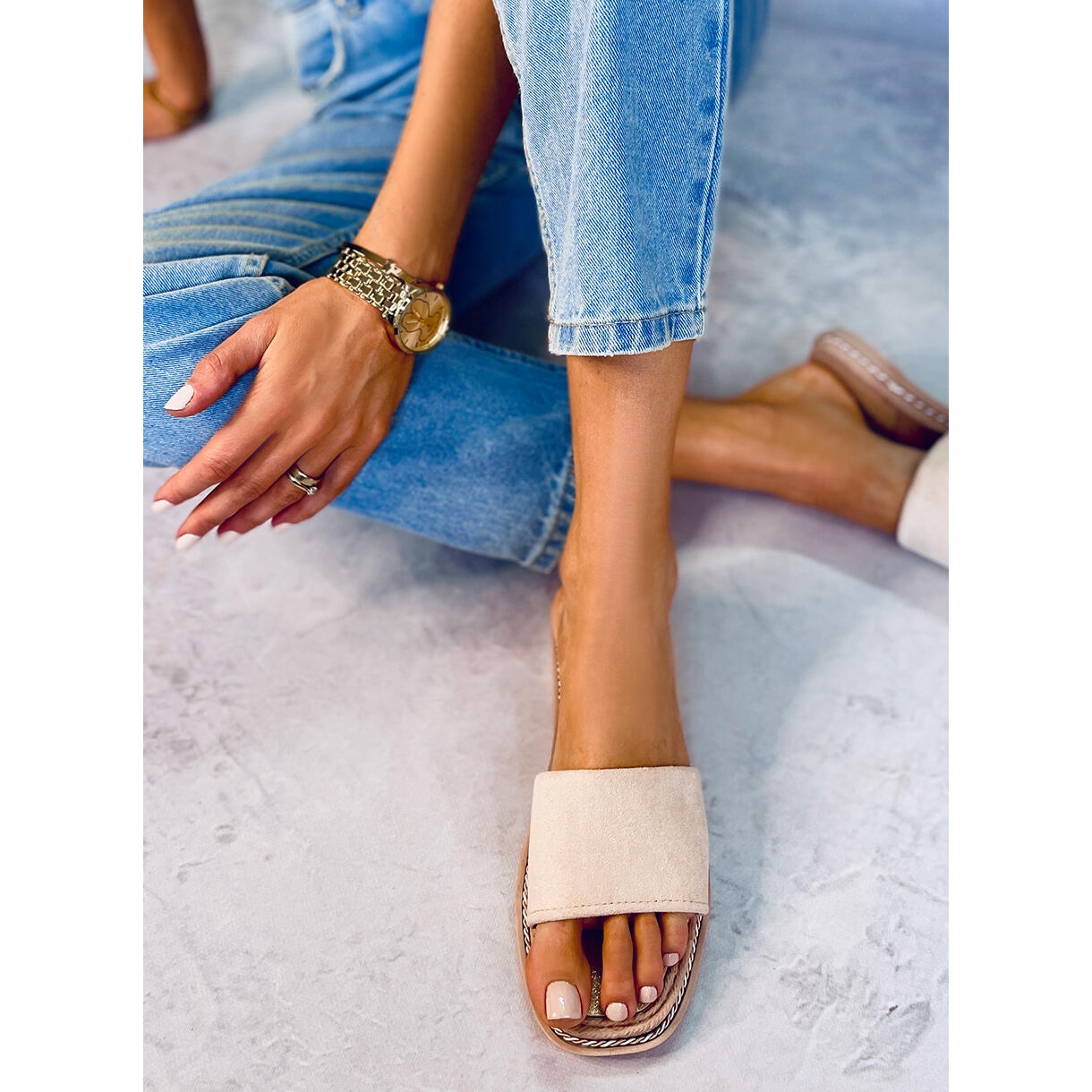 Șlapii sunt montați pe o talpă flexibilă, care oferă o amortizare suplimentară în timpul plimbărilor zilnice. Trimurile decorative și o inserție subtilă cu o textură strălucitoare le adaugă caracter, subliniind aura de vară și făcându-le o completare perfectă pentru orice stil de vară.