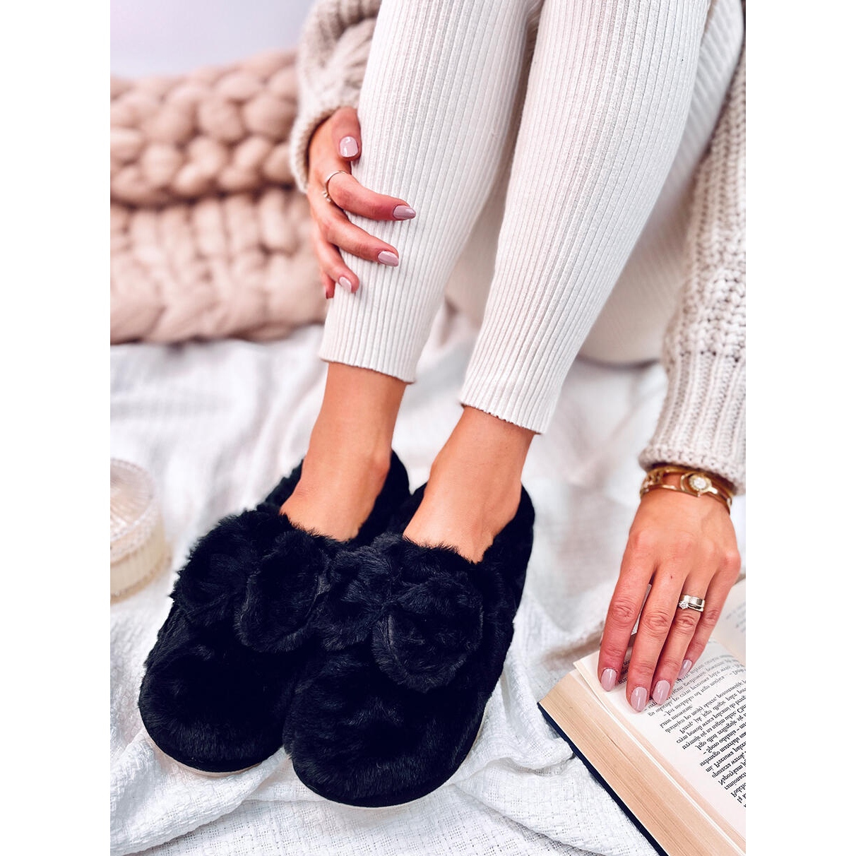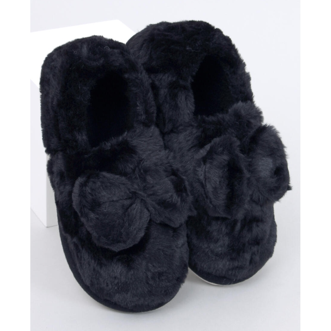 ** Papuci cu blană cu un arc Black Emres - luxul tău acasă! **