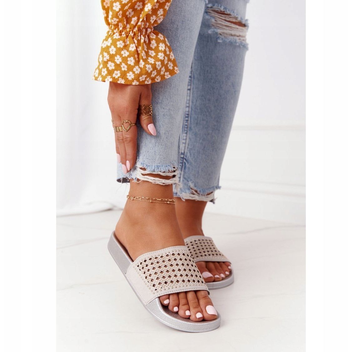 Slapii EVE se caracterizează printr-o talpă sintetică și o inserție de cauciuc care asigură confort de utilizare, chiar și în zilele cele mai călduroase. Designul lor la modă, îmbogățit cu detalii ajurate și strasuri, le face să se potrivească perfect cu stilurile de vară. Inaltimea platformei de 2 cm adauga un pic de pas fara a sacrifica confortul.