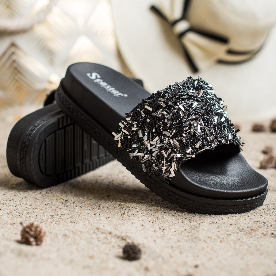 Descoperiți eleganța și confortul în stilul de zi cu zi cu șlapii Seastar With Crystals Fashion în negru. Acești șlapi casual de damă combină un design clasic cu un accent modern, ceea ce le face alegerea perfectă pentru următoarele zile de primăvară și vară.