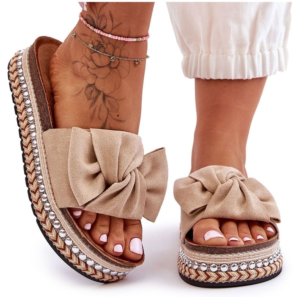 Papuci de damă din piele intoarsa cu fundita Bej Lauria bej - Suplimentul perfect pentru garderoba ta de vara