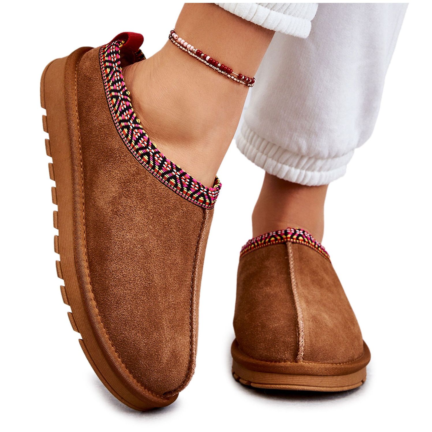 Elegant, alunecat -în Papcie Camel Buffie din piele de căprioară naturală de înaltă calitate. Blana moale și groasă din interior oferă o încălzire plăcută chiar și în zilele reci, iar platforma masivă (înălțime de 3 cm) și talpa care nu este alunecă garantează stabilitate și confort atunci când se plimbă prin casă.