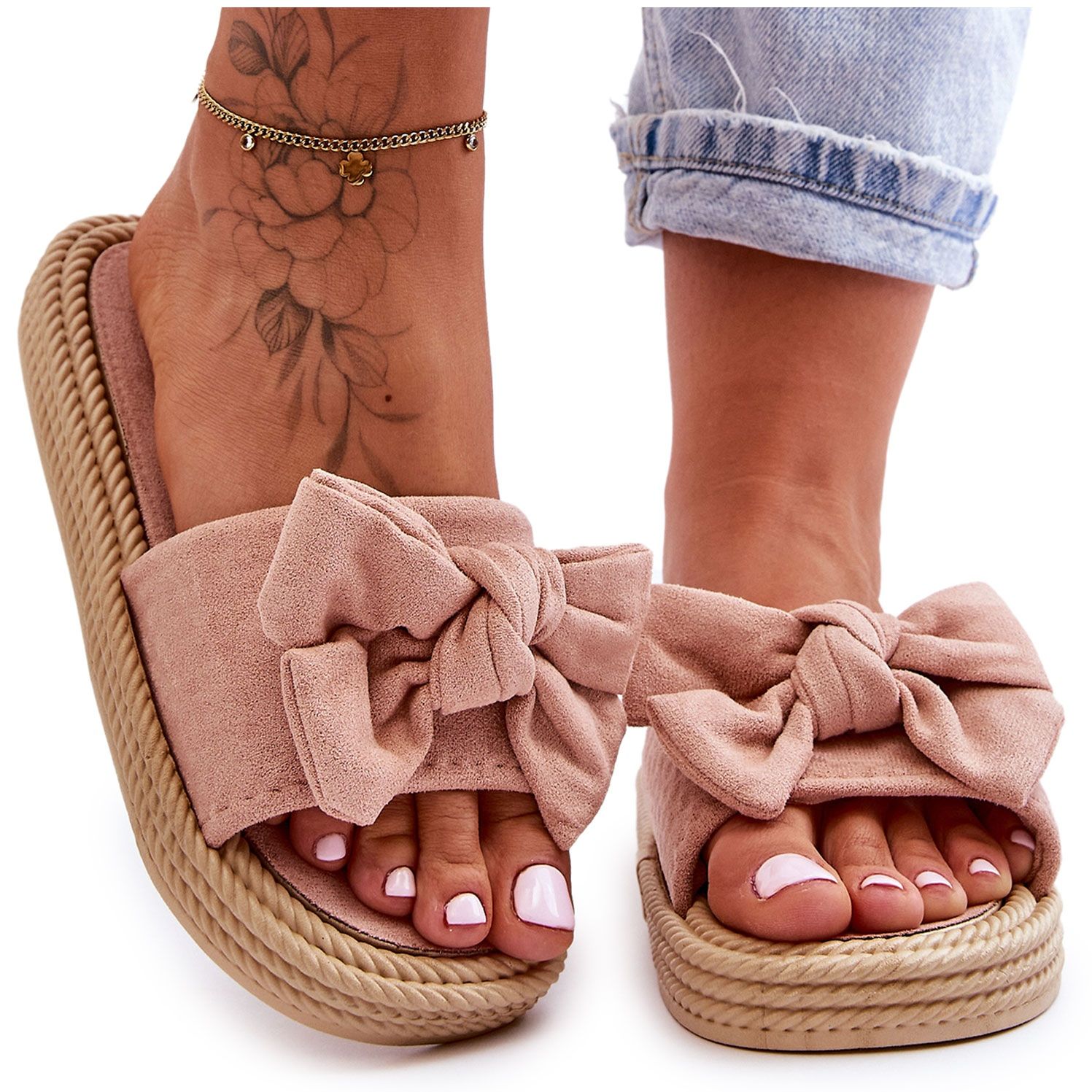 Detalii: Papuci de damă din piele intoarsa cu fundita roz Fency bej