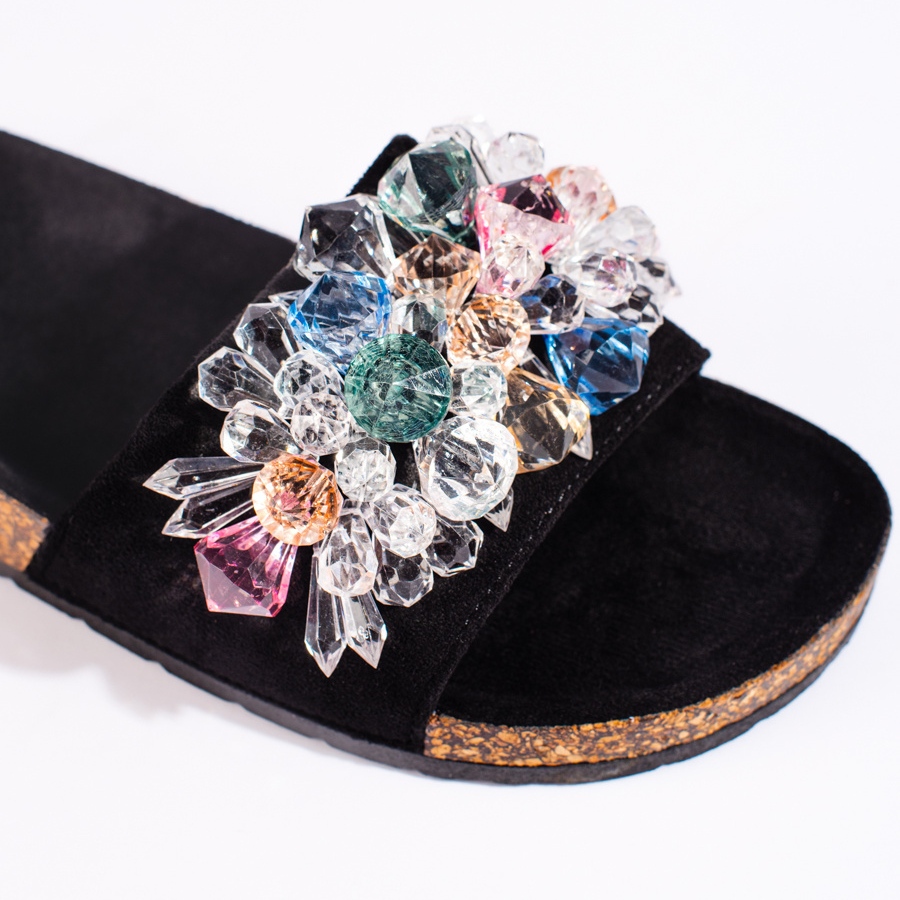 Talpa de plastic cu o rulare garantează stabilitate și aderență, ideală pentru plimbări în jurul orașului sau relaxare în grădină. Un avantaj suplimentar este detaliul subtil sub formă de strasuri, ceea ce oferă clapelor un caracter unic.
