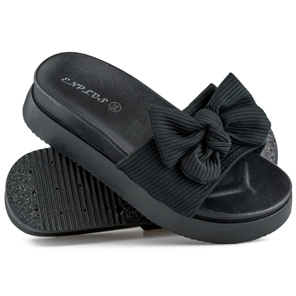 Detalii: Papuci de dama negre cu fundita pe talpa groasa negru