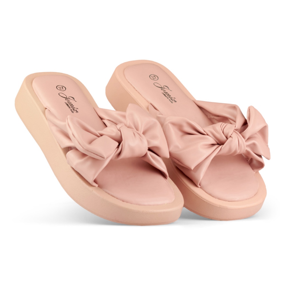 Designerii s-au concentrat pe simplitate și eleganță, care se exprimă în designul minimalist și nuanța pastelată la modă de roz, care conferă pantofilor un farmec de fetiță. O trăsătură caracteristică a acestor șlapi este o fundă delicată plasată pe partea din față a încălțămintei, adăugându-le frumusețe subtilă și un caracter unic.