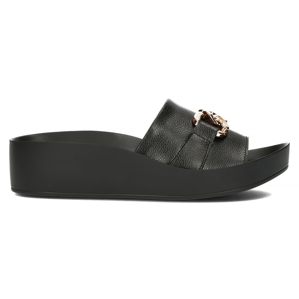 Flip-flops au un deget rotund și fără deget, ceea ce le face perfecte pentru zilele calde. Talpa lor din material sintetic de 4,5 cm înălțime și platforma înaltă de 2 cm garantează stabilitate și confort în timpul mersului. Un avantaj suplimentar este lanțul elegant care decorează șlapii, care le conferă un caracter unic.