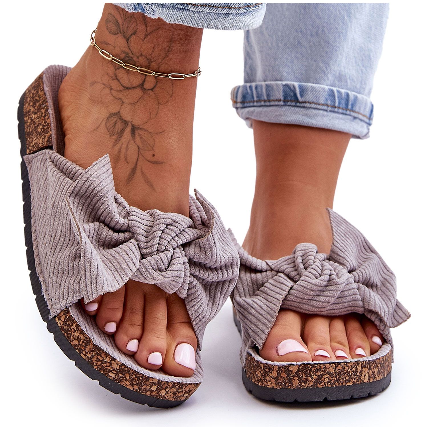Designul acestor șlapi este simplu și elegant, fără modele inutile, cu un mic accent fermecător sub formă de fundă, adăugând farmec la fiecare pas. Paleta de culori - gri cu accente maro suplimentare - va completa o gama larga de stiluri, iar culoarea neagra a talpii va adauga clasa.
