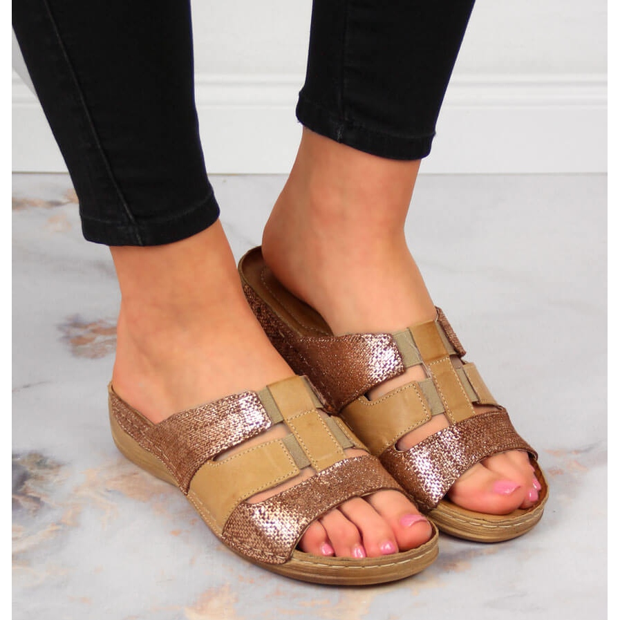 Detalii: Papuci elastic din piele bej și auriu Łukbut 1103 de aur