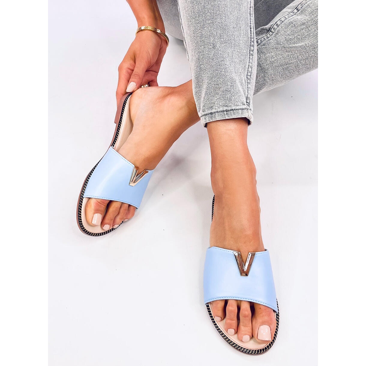 Cizme pentru femei papuci albastre de salcie - minimalism albastru, elegant, cu un luciu subtil. Papucii din piele ecologică atrag atenția cu un decor din aur în formă de aur, ceea ce le oferă un accent distinct, dar supus. Perfect pentru stilizări de zi cu zi, casual - pentru o plimbare, pentru a lucra în zile calde sau pentru a se întâlni cu prietenii.