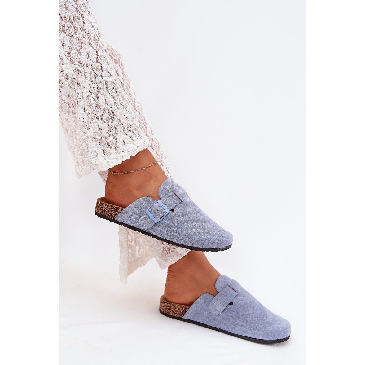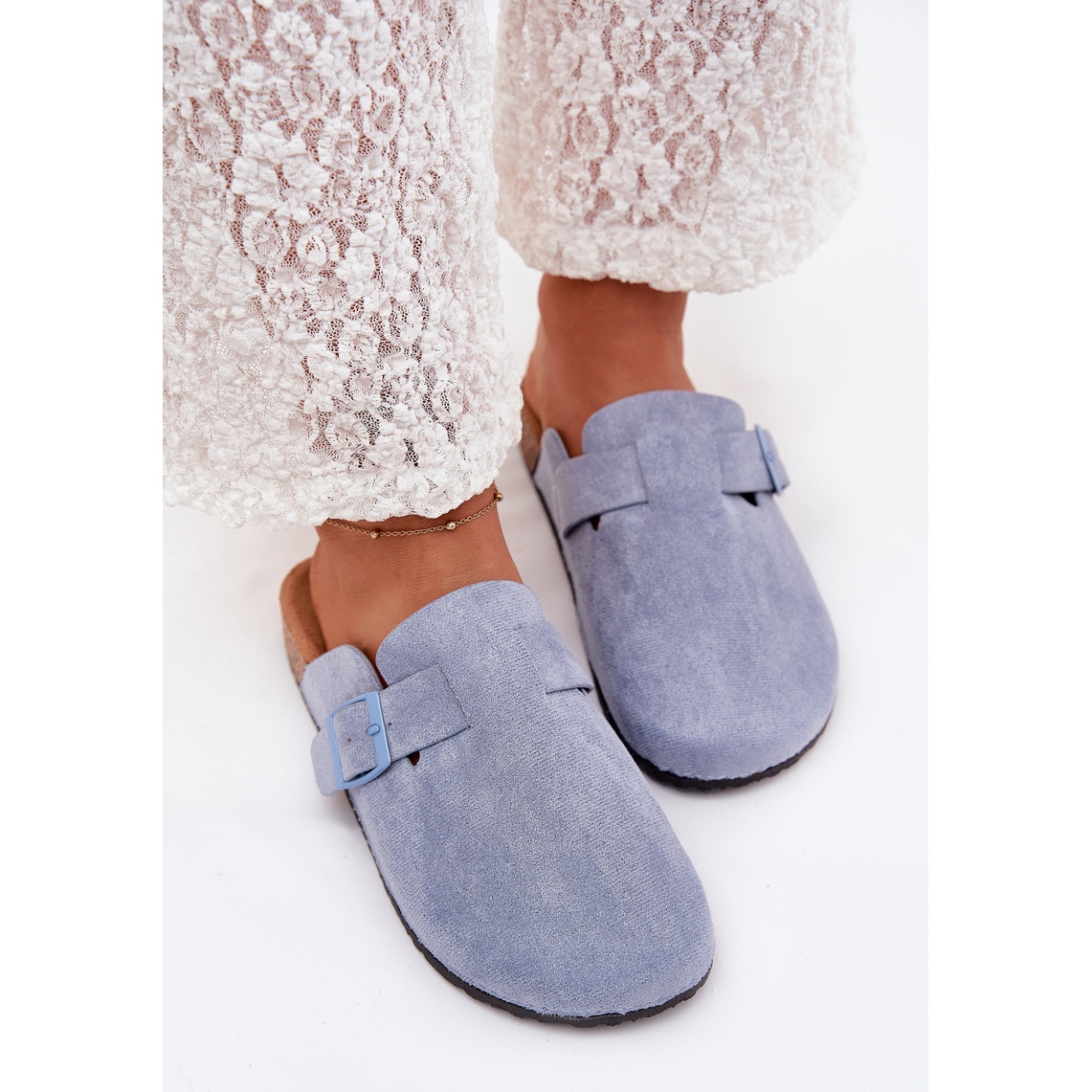 Papuci pentru femei pe o talpă din plută. Fabricate din Eco Suede, au nasuri acoperite pentru o protecție suplimentară, iar catarama vă permite să potriviți perfect piciorul. Datorită inserției profilate, acestea oferă confort pe parcursul zilei. Aceste flip -flop -uri sunt perfecte în fiecare zi, combinând confortul cu stilul la modă. Atunci când alegeți o dimensiune, vă rugăm să utilizați diagrama de mărimi.