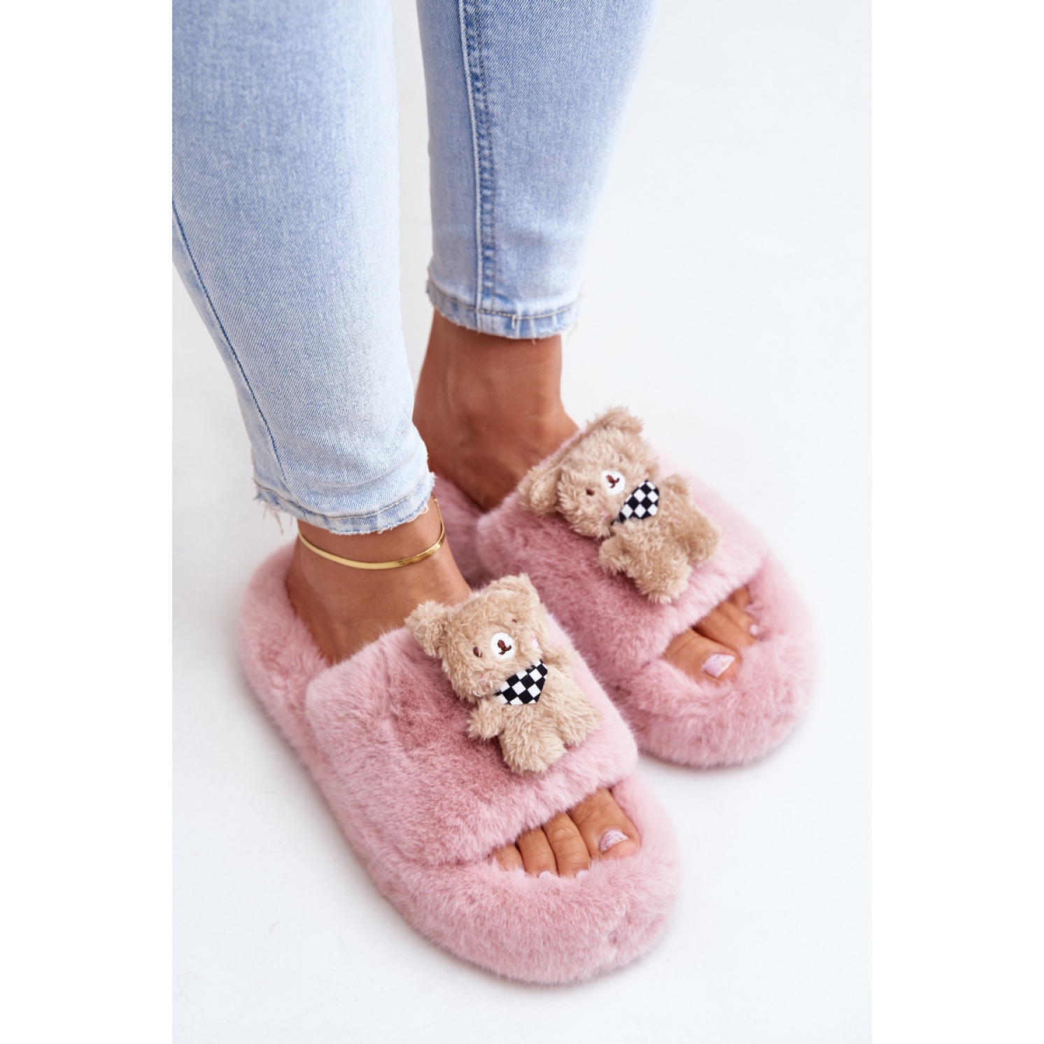Designul amuzant cu un ursuleț decorativ adaugă un caracter unic papucilor, făcându-i un plus ideal pentru relaxarea acasă. Datorită înălțimii reduse și platformei înalte de 4,5 cm, sunt extrem de confortabile și în același timp arată la modă pe fiecare picior.