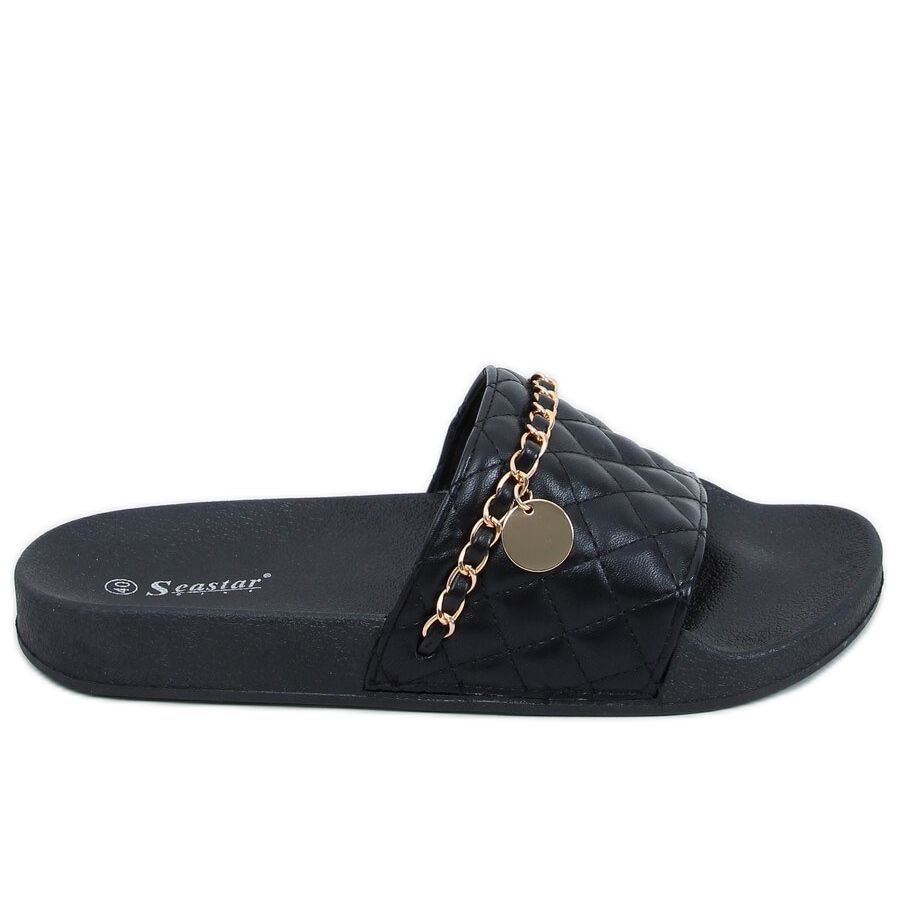 Descoperiți șlapii unici negri CK189P Black gold, care au devenit un simbol al stilului și eleganței verii. Acești șlapi eleganti pentru femei sunt alegerea perfectă pentru toate femeile care doresc să iasă în evidență din mulțime. Matlasarea impresionantă și un lanț frumos le conferă un caracter unic care va atrage atenția la fiecare pas.