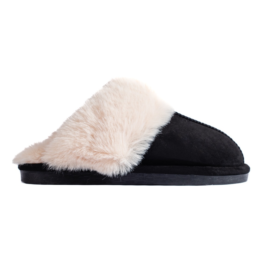 Papucii pentru femei Elegant și confortabil, pentru femei, concepute pentru utilizare zilnică acasă și în timpul ieșirilor scurte. Finisajul negru, textil în combinație cu blană moale din interior oferă căldură și confort plăcut pe tot parcursul sezonului.