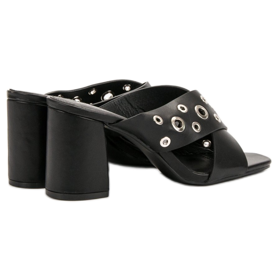 Șlapii negri nu numai că încântă prin designul lor, ci și expun picioarele și subțiază silueta, ceea ce le face o alegere perfectă pentru fiecare zi. Datorită tocului înalt de 8,5 cm, oferă o completare eficientă ținutelor casual. Perfecti pentru zilele de primavara si vara, acesti slapi sunt confectionati din piele ecologica, care garanteaza atat stil cat si confort.