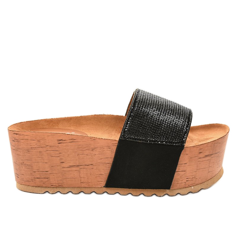 Pantofii negri cu platformă 77-99 sunt o alegere extrem de originală pentru femeile care vor să iasă în evidență prin stilul lor. Aceste șlapi unice se caracterizează printr-o talpă puternică, stabilă, cu o înălțime de 6,5 cm, care asigură confort în timpul utilizării de zi cu zi. Cureaua groasă le oferă un aspect atrăgător, potrivindu-se perfect cu atmosfera rock.