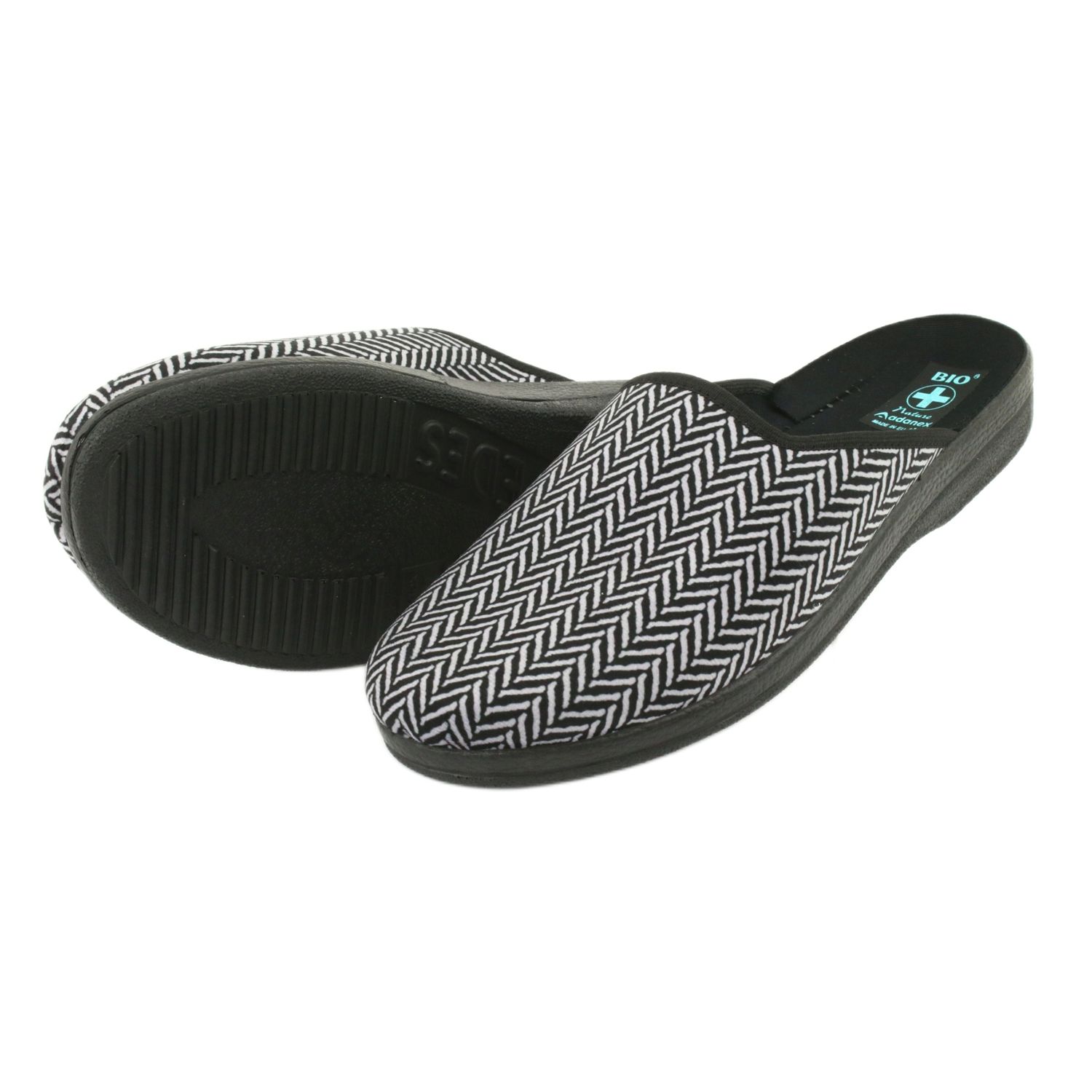Papuci pentru bărbați eleganți ai brandului polonez Adanex a făcut din velur moale cu herringbone subtile în nuanțe de negru și gri. Talpa de spumă PU profilată, mai groasă, asigură lejeritate și amortizare, datorită cărora plimbarea prin casă este mai confortabilă și mai puțin împovărătoare pentru articulații. Structura introdusă facilitează asumarea rapidă, iar materialele respirabile le pasă de confortul termic al picioarelor.