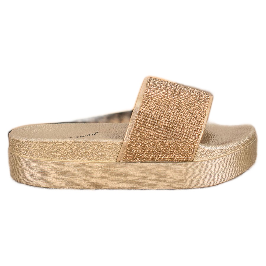 Flip-flops se remarcă prin detalii elegante - cristale subtil strălucitoare care creează un efect 100% glamour, potrivindu-se perfect cu nuanța aurie nobilă. Aceștia sunt pantofi de zi cu zi perfecti, care vor adăuga un pic de strălucire și unicitate oricărui stil.