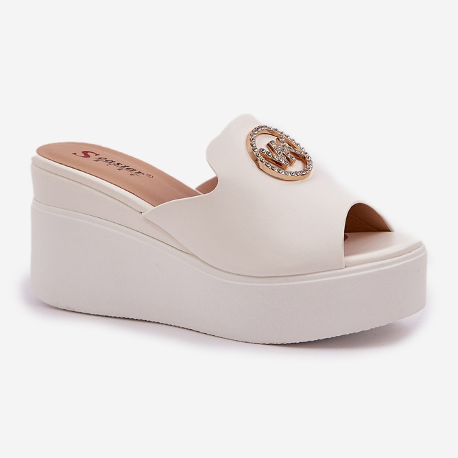 Detalii: Papuci pe platformă și pene cu un ornament alb