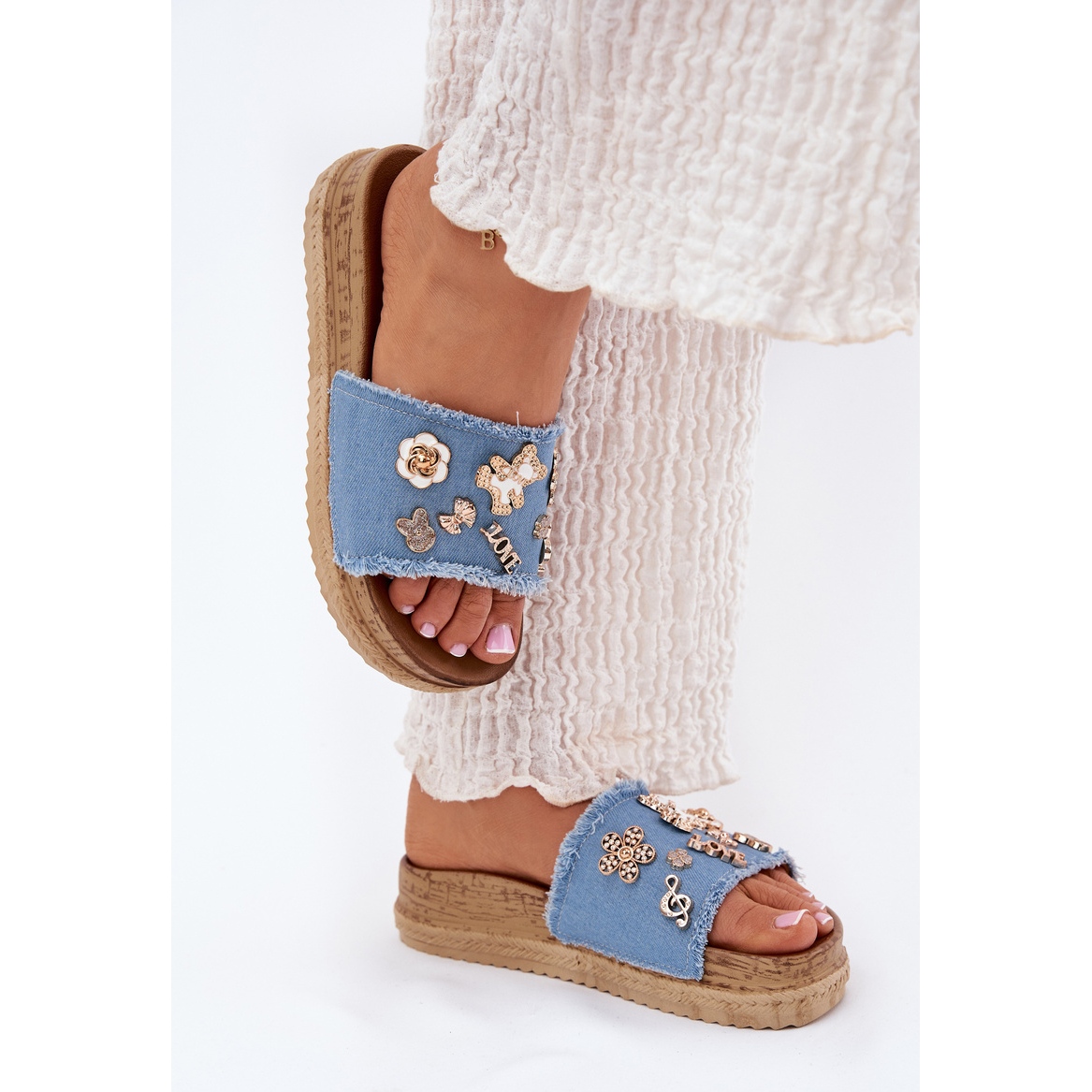 Detalii: Papuci pentru femei cu ace de aur pe platforma albastră albastru