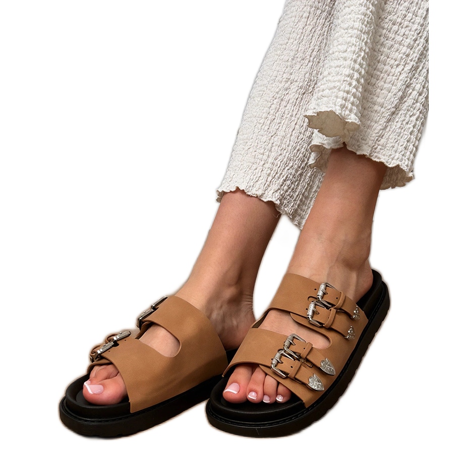 Inna marka Papuci pentru femei maro cu catarame decorative bej