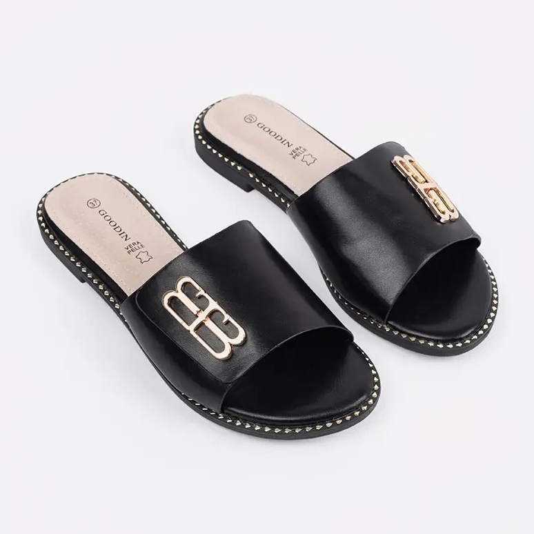 Goodin Goodin Papuci pentru femei negre pe o talpă plată cu ornament negru