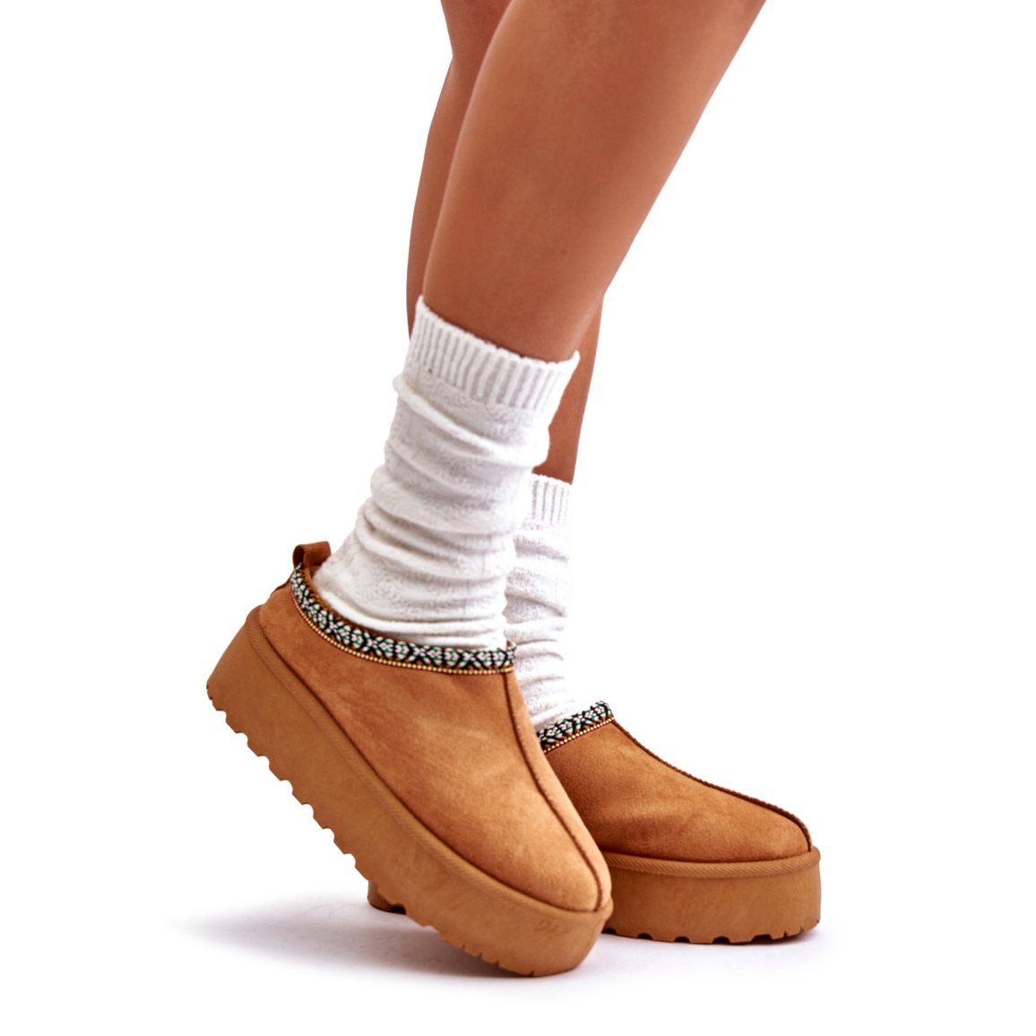 Papucii sunt confectionati din piele intoarsa ecologica, ceea ce le confera un aspect elegant si durabilitate. Partea superioară a căsuței este decorată cu broderii subtile, oferindu-le un farmec unic. Montate pe o platformă masivă de 4,5 cm înălțime, vă izolează efectiv picioarele de pământul rece, ceea ce le face o alegere ideală pentru zilele mai reci.