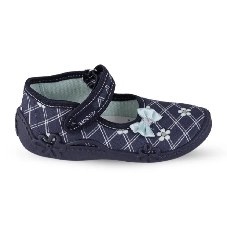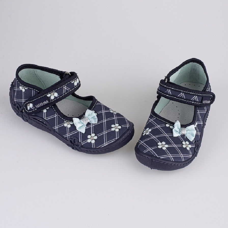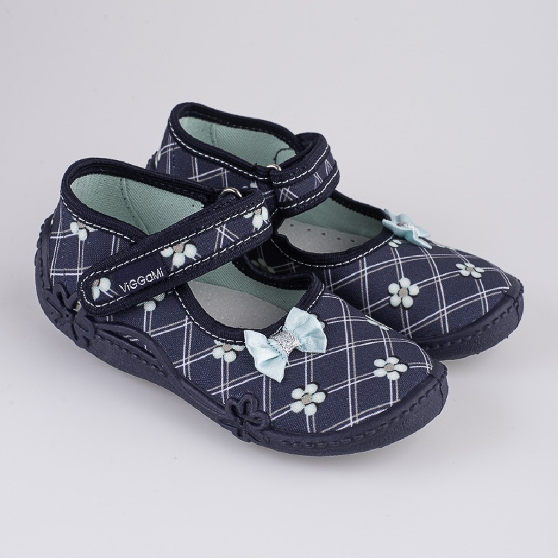 Papuci pentru copii confortabili Viggami Emma într -o culoare albastră universală cu un imprimeu decorativ. Proiectat pentru utilizare zilnică la domiciliu și grădiniță - confortabil, sigur și ușor de pus datorită elementelor de fixare Velcro.