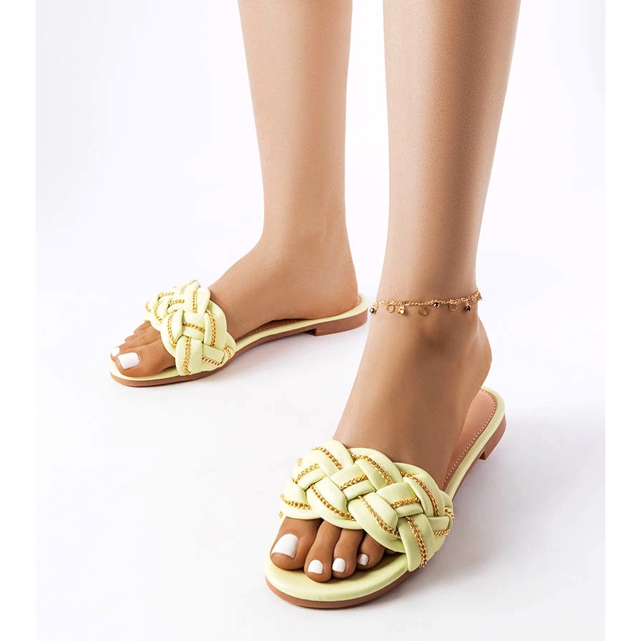 Correra - Flip -flop -uri verzi, elegante, pe care trebuie să le aveți în această vară. Caracteristica lor, superioară împletită, cu un lanț subtil oferă stilului o tocană la modă, feminină și un verde universal se îmbină perfect cu rochii de vară, seturi de in sau pantaloni scurți din denim.