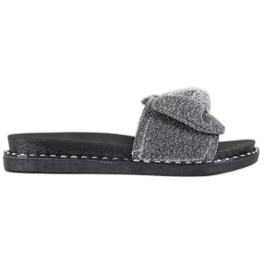 Descoperiți un stil unic pentru zilele de vară cu șlapii VINCEZA cu sclipici în negru și gri. Acești pantofi la modă sunt o alegere perfectă pentru femeile care prețuiesc confortul și originalitatea. Suprafața lor strălucitoare, decorată cu sclipici, le conferă un caracter unic, iar o fundă subtilă adaugă eleganță.