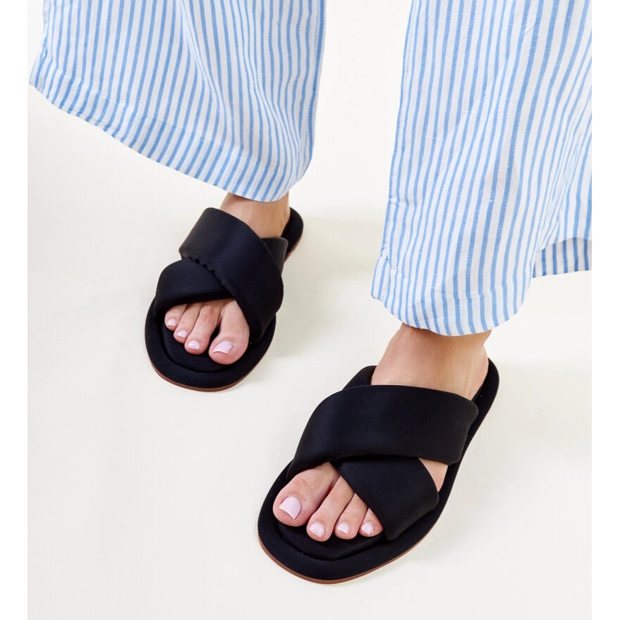 Descoperiți papucii negri ai Randa - Perfect pentru zilele de vară! Acești pantofi eleganți combină confortul și designul la modă. Un deget rotund și un design plat le fac o alegere ideală pentru zilele călduroase, asigurând confort toată ziua.