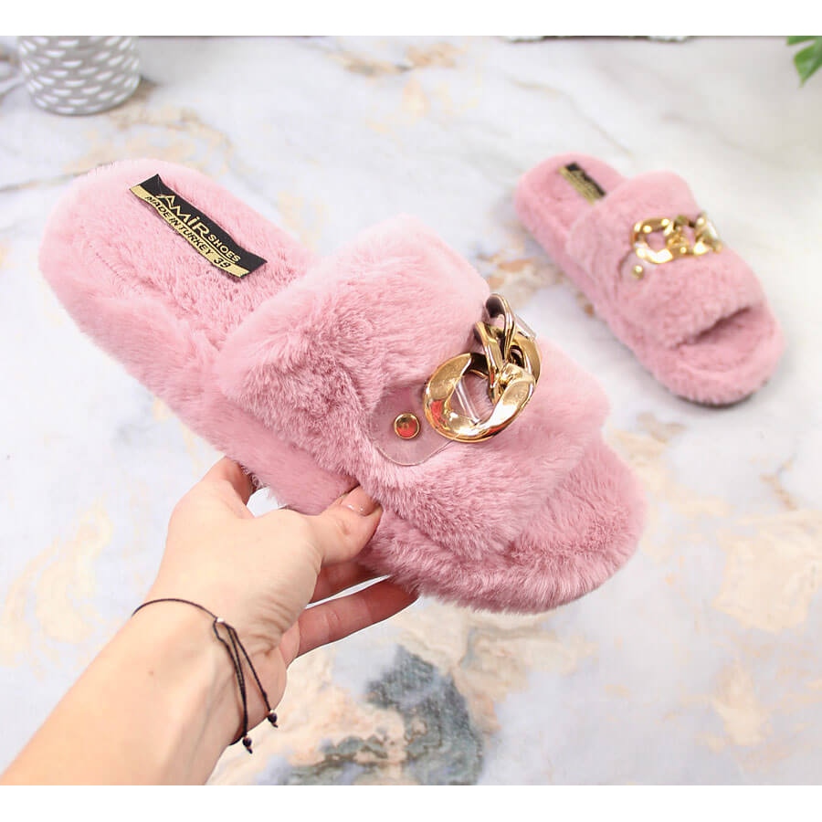 Nu așteptați! Adaugă o notă de lux și căldură stilului tău acasă cu papuci de pluș cu un lanț de la T.Sokolski în culoarea roz.