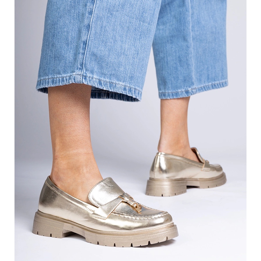 Structura alunecată și nasul rotund sunt caracteristici practice care permit punerea ușoară și eliminarea mocasinelor. Talpa de plastic din aceeași nuanță de aur se armonizează armonios cu restul pantofului, creând un întreg coerent. Talculul organic din piele are grijă de confort, ceea ce le face să fie purtate ore întregi fără disconfort.