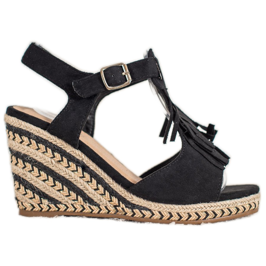 Iată opțiunile perfecte pentru vară - pane de piele intoarsa neagra cu franjuri de la producatorul Small Swan. Acest model este un clasic care va funcționa în orice situație. Datorită culorii universale, aceste sandale se potrivesc perfect atât cu o rochie albă elegantă, cât și cu blugi albaștri casual, oferind un aspect elegant fiecărei femei.