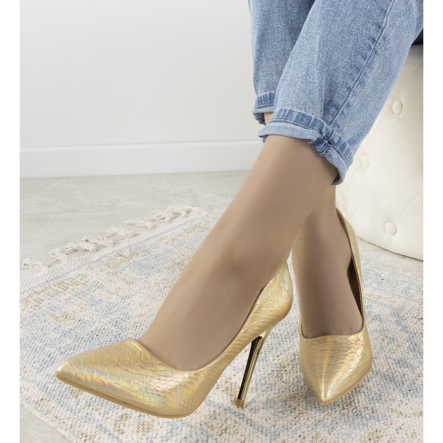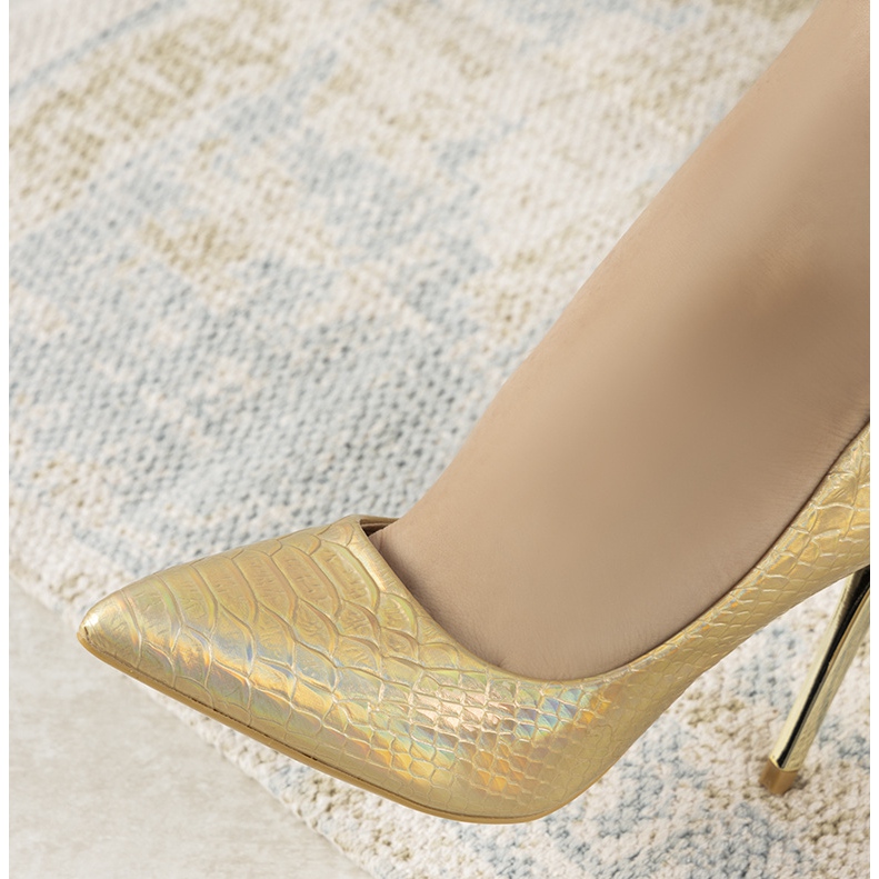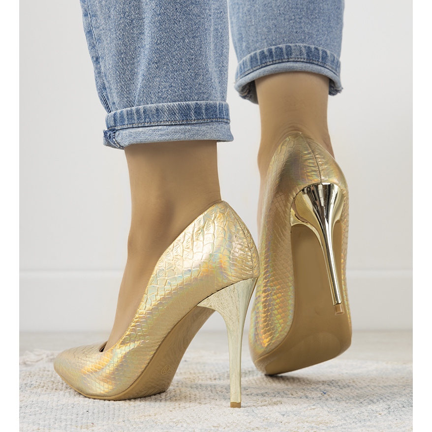 Descoperiți o eleganță extraordinară și un pic de strălucire cu tocuri înalte Craigie holografice aurii! Aceste pompe unice vor fi o alegere perfectă pentru orice eveniment, atrăgând atenția prin originalitatea și finisajul lor unic. Suprafața holografică face ca fiecare pas să emane cu magie, iar reflexele subtile ale luminii adaugă un caracter unic.
