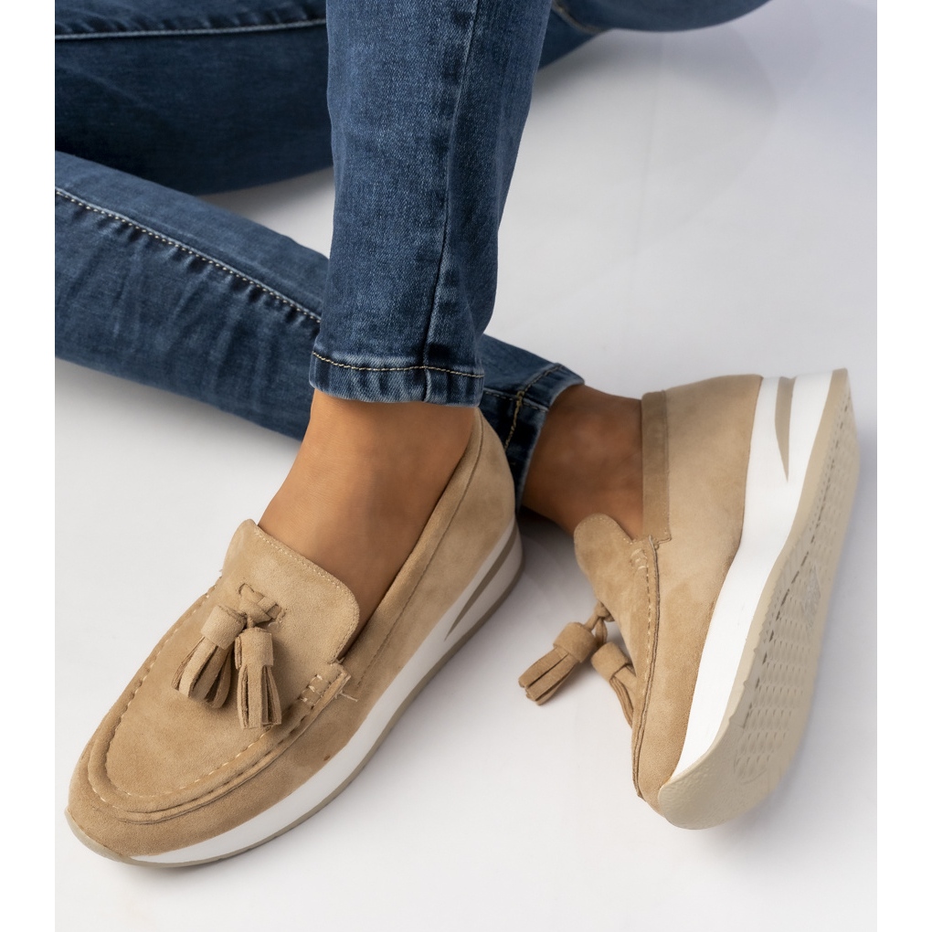 Aceste mochete nu sunt doar încălțăminte, ci este o modă obligatorie, care se armonizează perfect cu diverse stilizări. Culoarea bej le face universale și se adaptează cu ușurință atât la ținute casual, cât și mai formale.