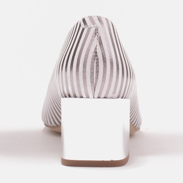 Culorile pantofilor - alb și argintiu - permit o combinație universală cu diverse culori și stiluri de haine. Modelul în dungi este un element care face pompele atât la modă, cât și atemporale.