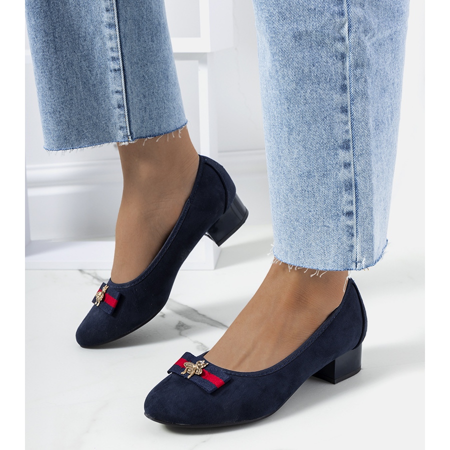 Pompele Vijver se bucură de calitatea manoperei și a detaliilor. Panglica bleumarin și roșie cu papion decorativ arată uimitor! Partea superioară este confecționată din piele ecologică de piele de căprioară. Un toc mic va sublinia delicat silueta;) Brantul din piele ne va oferi confort in timpul purtarii. Numerotare standard, vă rugăm să urmați dimensiunea dvs.