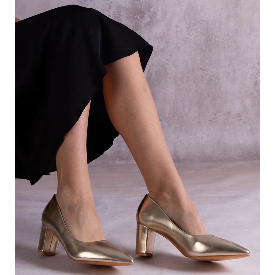 Pompele au un nas ascuțit, ceea ce le oferă clasă și stil. Culoarea aurie a materialului extern, realizată din piele ecologică de înaltă calitate, atrage atenția și este perfectă în combinație cu diverse stilizări, de la zi cu zi la seară. Un avantaj suplimentar este talpa de plastic bej, care asigură confortul utilizării.