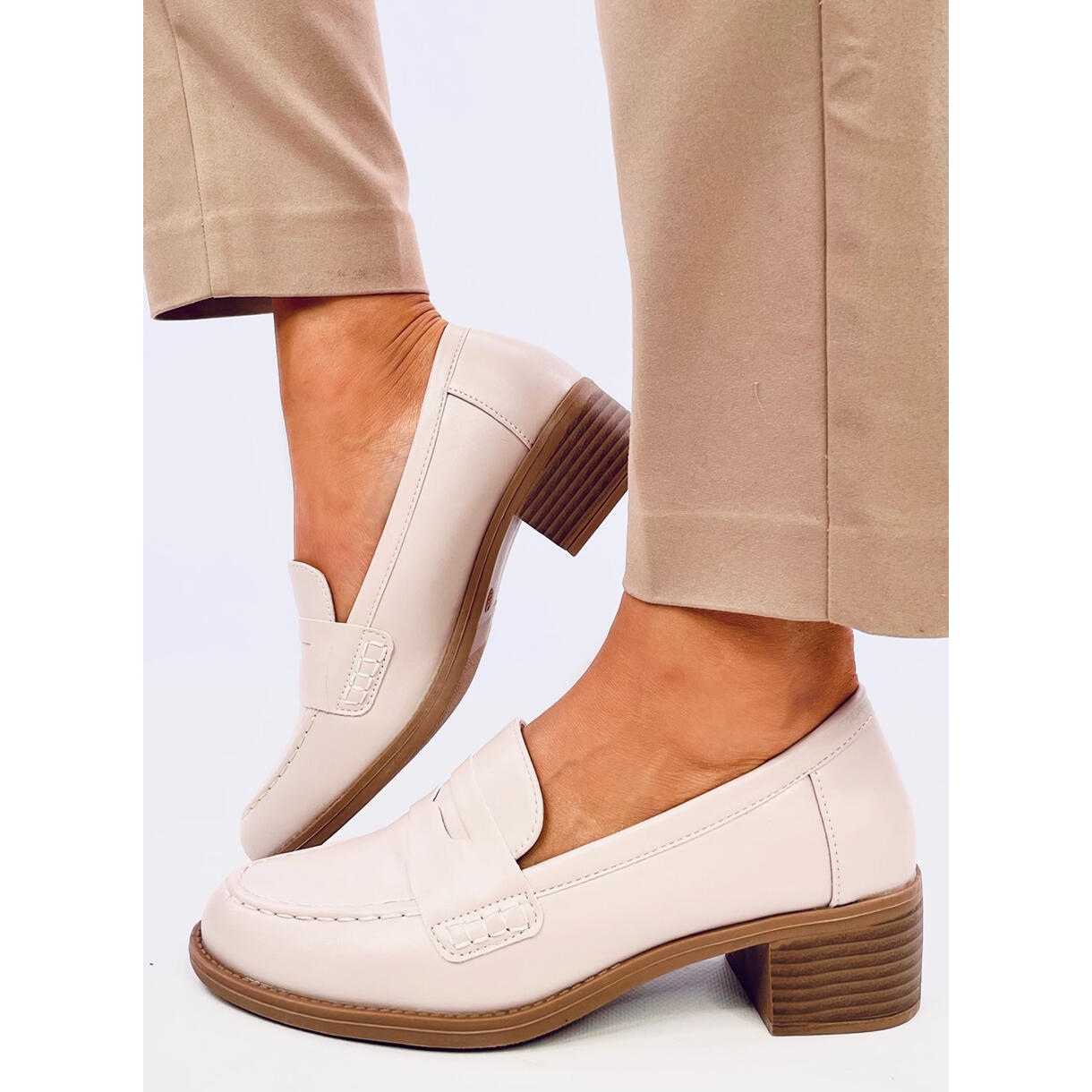 Oferim mocasini frumosi cu toc lat in bej, perfecti pentru orice situatie. Realizate din piele ecologica de inalta calitate, aceste pompe full-grain nu sunt doar estetice, ci si extrem de confortabile. Tocul înalt de 4,5 cm vă permite să vă mișcați confortabil toată ziua, iar cusăturile caracteristice le conferă un caracter unic inspirat din stilul mocasinilor.