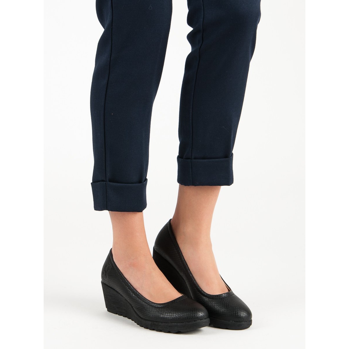 Pompele se caracterizează printr-un toc stabil, încorporat și o talpă de cauciuc cu benzi de rulare, care asigură confortul la purtare și pas încrezător. În interiorul pantofilor există un branț confortabil din piele ecologică, ceea ce înseamnă că nici orele lungi în pantofi nu vor fi obositoare.