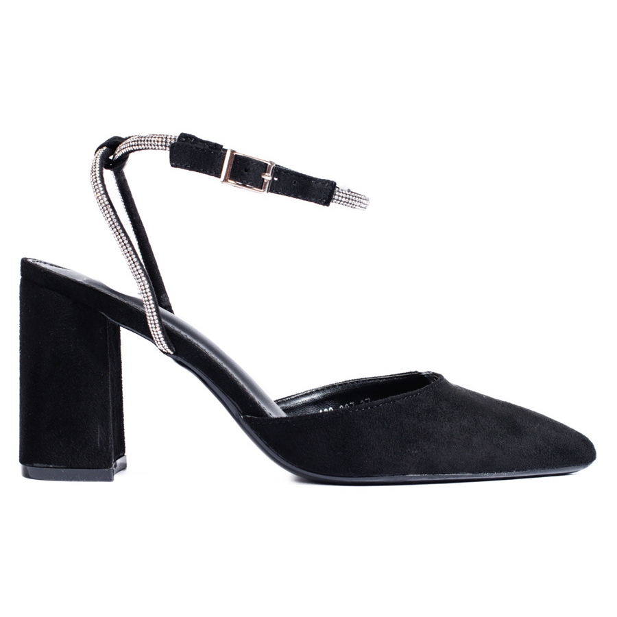 Pompele de piele intoarsa neagra cu toc deschis de la Shelovet sunt, de asemenea, decorate cu strasuri subtile, adaugand o stralucire exclusiva intregului. Culoarea suplimentară argintie este un accent discret, dar rafinat.