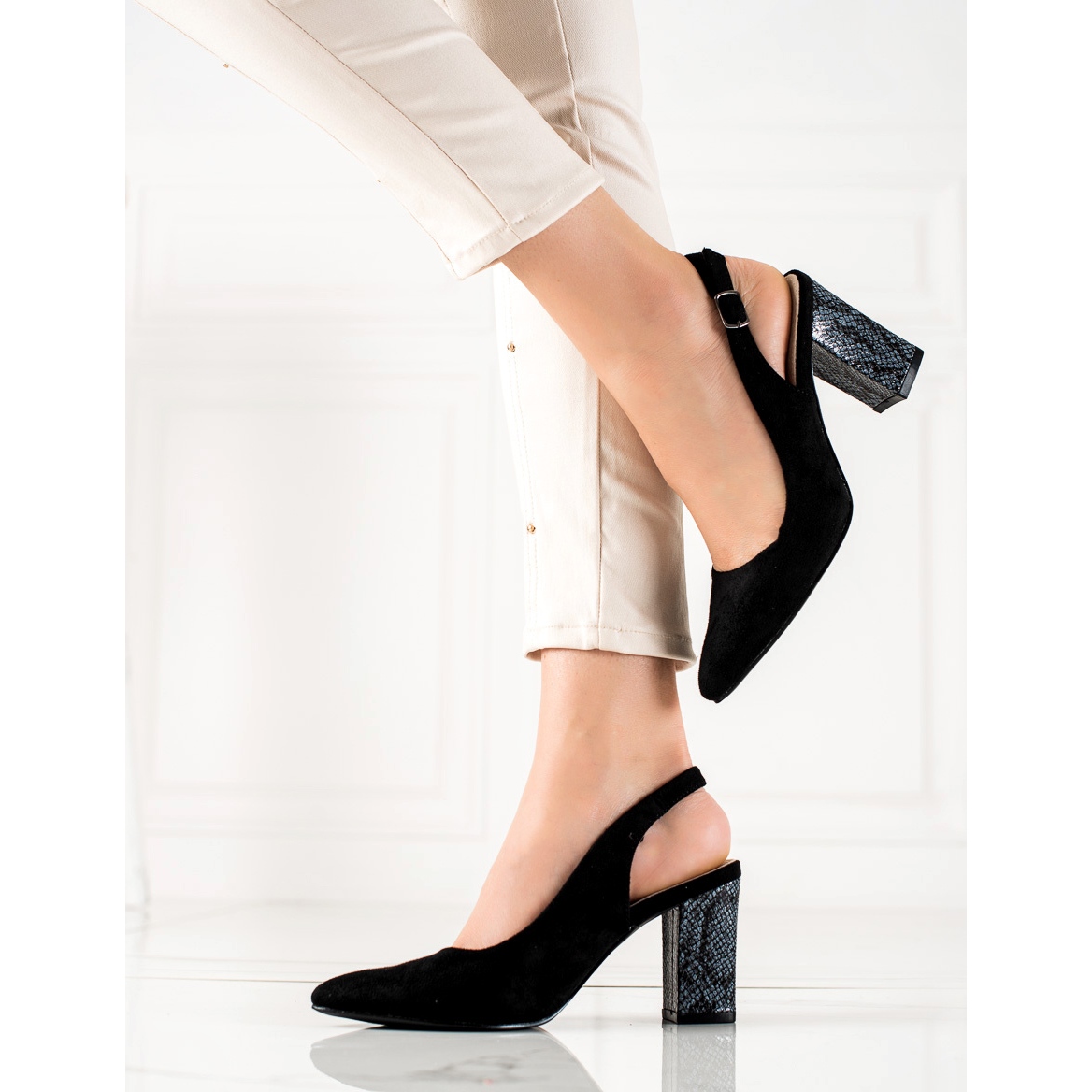 Aceste pompe clasice și elegante sunt perfecte pentru diverse ocazii - atât pentru ieșirile de seară, cât și pentru sărbători importante. Înălțimea tocului de 8,5 cm adaugă eleganță, asigurând în același timp stabilitate datorită tocului bloc. Catarama si inchiderea cu alunecare faciliteaza incaltarea si scoaterea pantofilor.